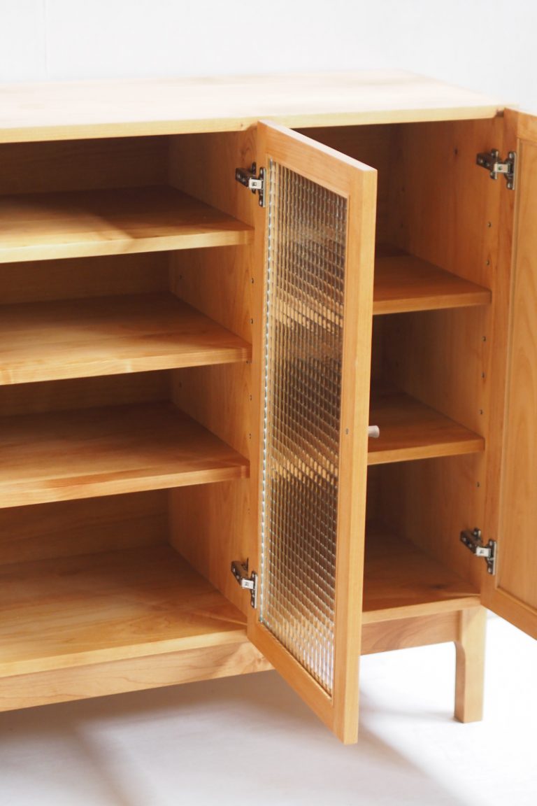 中の棚板は可動棚です。棚板も無垢材なのが、MUKUCABです。扉がガラスだと、見た目も違ってきます。