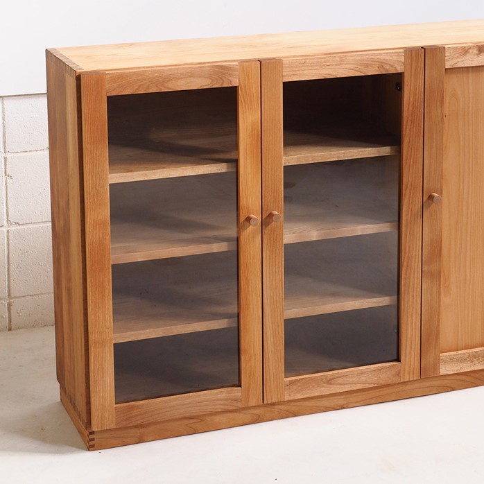 中の棚板は3枚セットしてあります。可動棚で、棚板だけ追加することもできます。右側には本など収納予定。なので棚板は2枚セットしました。扉の取っ手は、無垢キャビの標準は直径15mmのダークブラウン着色ですが、今回は、よりナチュラルな風合いに仕上げるために直径20mmの無着色としました。(ドロワーDRWなどの取っ手です)