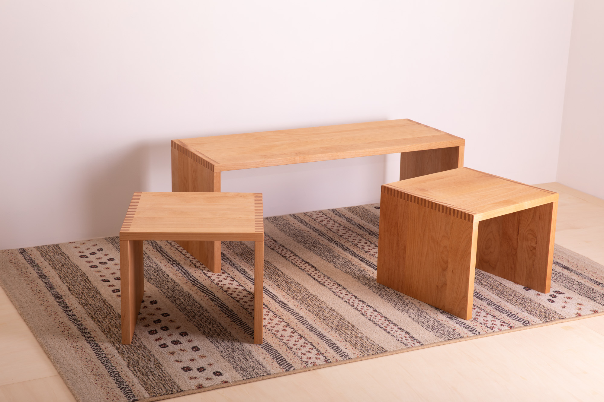 使わない時は1番大きなベンチ、ローテーブルの下に入れ子で収納ができ、小さい方の二つを色々な場面で出してきて、椅子として使いたいというご要望でした。収まり良く収納されていると気持ちがいいですね!